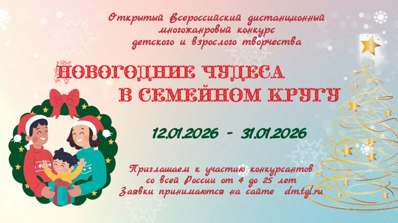 Приглашаем принять участие в Открытом Всероссийском дистанционном многожанровом конкурсе детского и взрослого творчества «НОВОГОДНИЕ ЧУДЕСА В СЕМЕЙНОМ КРУГУ», который проводится муниципальным бюджетным образовательным учреждением дополнительного образования «Дворец творчества детей и молодежи» городского округа Тольятти! Сроки проведения: с 12 января 2026 по 31 января 2026 года. Подведение итогов 02 февраля 2026 года. В конкурсе принимают участие творческие коллективы, отдельные исполнители, учащиеся образовательных учреждений с 4 до 25 лет, семейные коллективы. Заявка на участие в конкурсе заполняется на сайте МБОУДО ДТДМ dm.tgl.ru в меню «Заявка "Новогодние чудеса в семейной кругу"» по установленной форме (обязательно заполняются все поля). Согласие на обработку персональных данных дается автоматически при регистрации заявки на сайте, нажатием кнопки «Согласен на обработку персональных данных». ЗАЯВКИ НА УЧАСТИЕ принимаются до 31 января 2026 ГОДА. Подтверждением получения заявки является ответное письмо МБОУДО ДТДМ с договором на ваш электронный адрес. Письмо приходит в течение 3 рабочих дней. Электронные дипломы рассылаются в течение 10 рабочих дней после подведения итогов. Положение конкурса