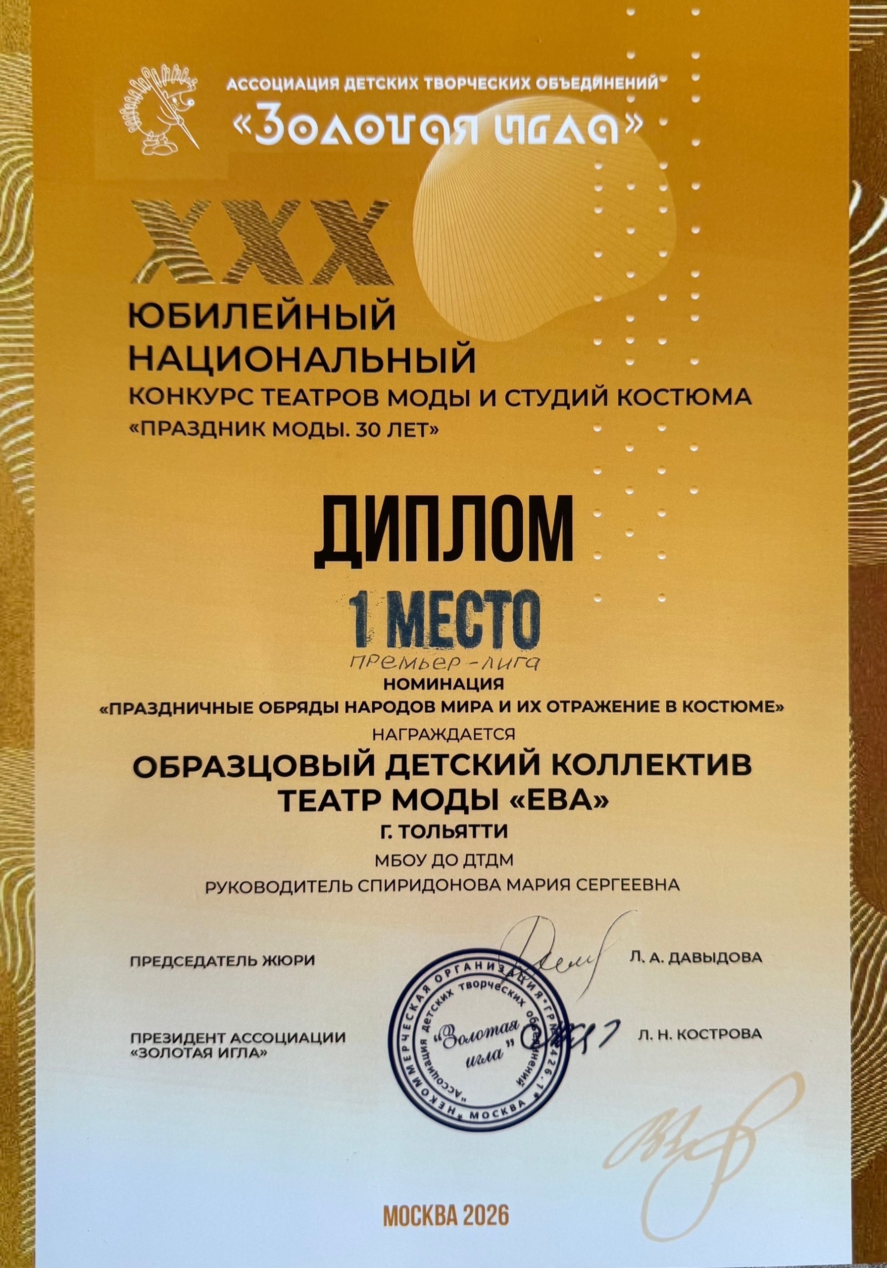 | Поздравляем образцовый детский коллектив театр моды «Ева» Дворца творчества детей и молодежи г.о. Тольятти с успешным участием в XXX Национальном конкурсе «Золотая игла» для детских театров моды и студий костюма «Праздник моды», Москва! Ассоциация «Золотая |